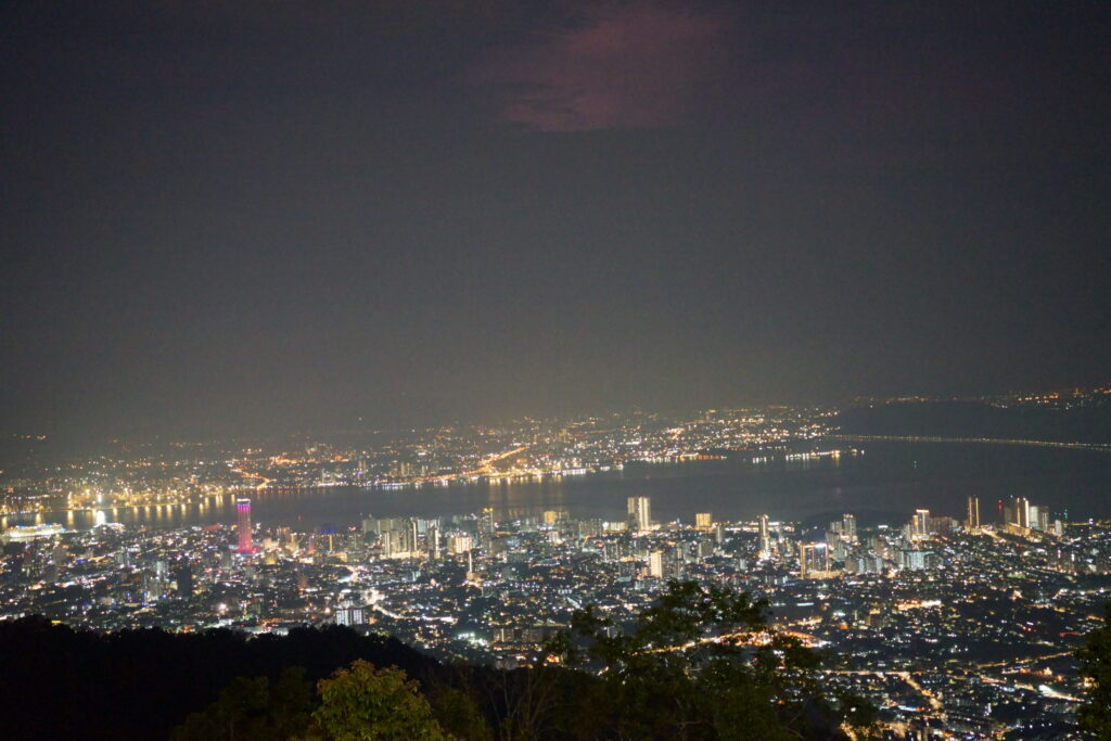 Iets buiten de stad ligt Penang Hill. Penang hill is ongeveer 833 meter hoog, daarom rijdt er regelmatig een treintje omhoog. De trein ging op sommige stukken zeer steil omhoog. Eenmaal aangekomen op de top heb je prachtig uitzicht over Georgetown. Als je goed zicht hebt kun je ook het vaste land zien. Wij bekeken hier de zonsondergang. Omdat het Suikerfeest was, zagen we veel vuurwerk in de stad afgaan.